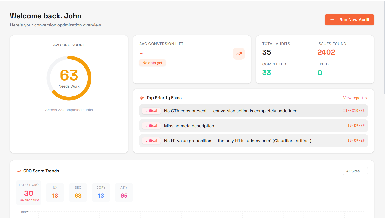 Complete audit with CRO Score, revenue impact, and prioritized fixes